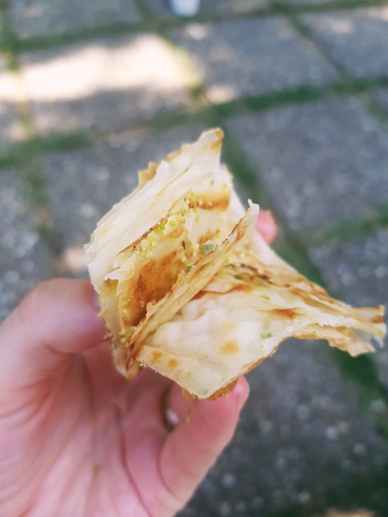 Am stat ca tot romanu’ la o coada relativ mica pentru a cumpara placinte cu fistic: KATMER. Pot sa zic atat: a meritaaaat! Am mancat toti trei ( i-am dat si lui Alexandru sa guste putin). Are foi de baclava, lapte, fistic si miere.