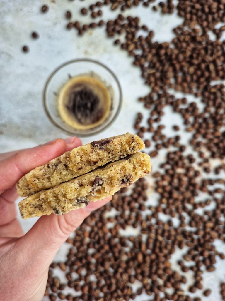 Sunt fragezi, au un gust discret de cafea, iar bucatile de ciocolata sunt un bonus :). Nu aveti nevoie de multe ingrediente si se pregatesc destul de repede. Gasiti mai jos reteta pentru 12 biscuiti mari sau 15 medii (depinde de voi cat de mari ii doriti).